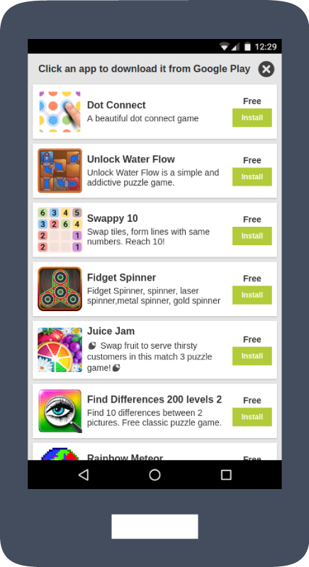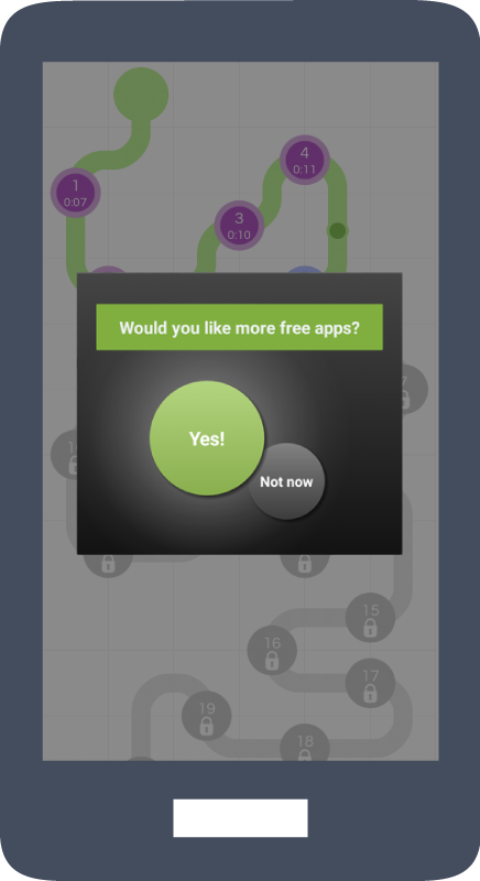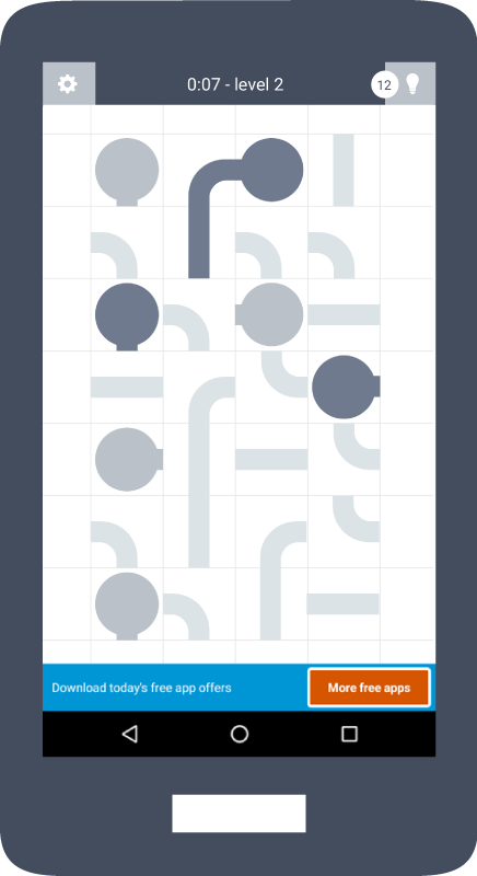 Promote free apps to your users with a “More apps” button or menu item. It will take the user to our AppBrain offerwall, where they can download free apps.