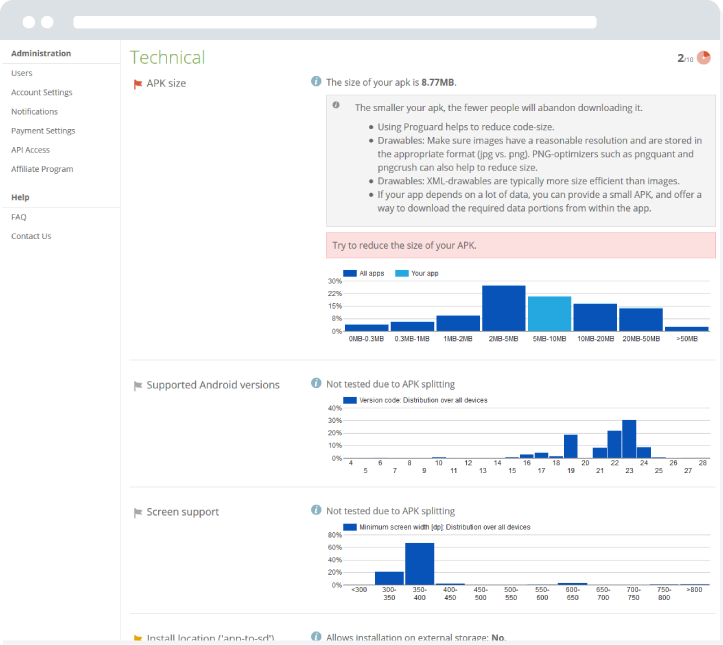 Learn how you can improve your app to get more downloads. The AppBrain Apptimizer investigates key aspects that influence your app's popularity and suggests concrete actions when weaknesses are detected.