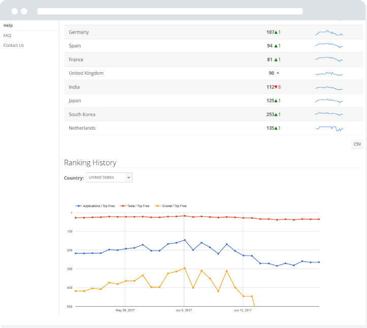 Track your app's Google Play ranking in different countries and app categories. View the ranking history of the past 30 days and benchmark your app's ranking against the rankings of your top competitors.